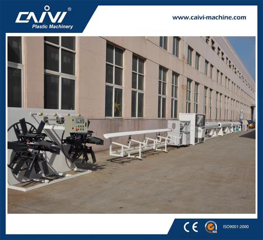 原料+色母料→混合→真空上料→材料干燥→單螺桿擠出機→四色線擠出機→籃式模具→定徑套→噴淋真空定型箱→噴淋真空定型箱→噴淋冷卻水箱→噴淋冷卻水箱→色帶印字機→履帶式牽引機→行星切割機→管材堆放架→成品檢測包裝
